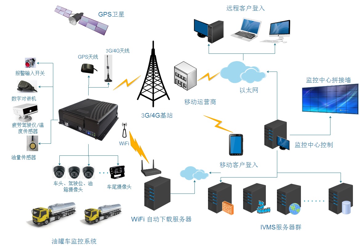 服務(wù)器監(jiān)控中心是由IVMS服務(wù)器群、后臺(tái)管理軟件及客戶端軟件構(gòu)成的遠(yuǎn)程監(jiān)控與管理中心,它采用集中化、分布式網(wǎng)絡(luò)管理架構(gòu),可同時(shí)實(shí)現(xiàn)多臺(tái)車輛的遠(yuǎn)程實(shí)時(shí)監(jiān)控、錄像、抓拍;錄像搜索、下載、分析回放;并結(jié)合GIS電子地圖可查看車輛分布狀態(tài);查詢行車軌跡并回放;查看報(bào)警信息,快速定位報(bào)警車輛的地理位置及現(xiàn)場(chǎng)視頻等。同時(shí),在車輛集中的停車場(chǎng)配置WiFi自動(dòng)下載服務(wù)器,可自動(dòng)將監(jiān)控錄像文件下載到指定的服務(wù)器存儲(chǔ)。